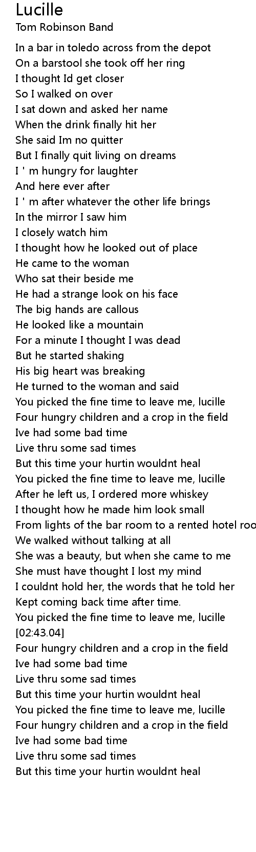 | [03:03.78] | You picked the fine time to leave me, lucille |