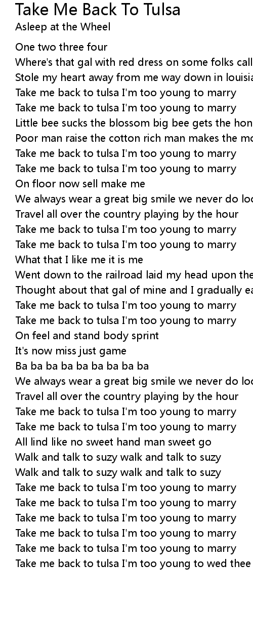 Take me back to tulsa I'm too young to wed thee |