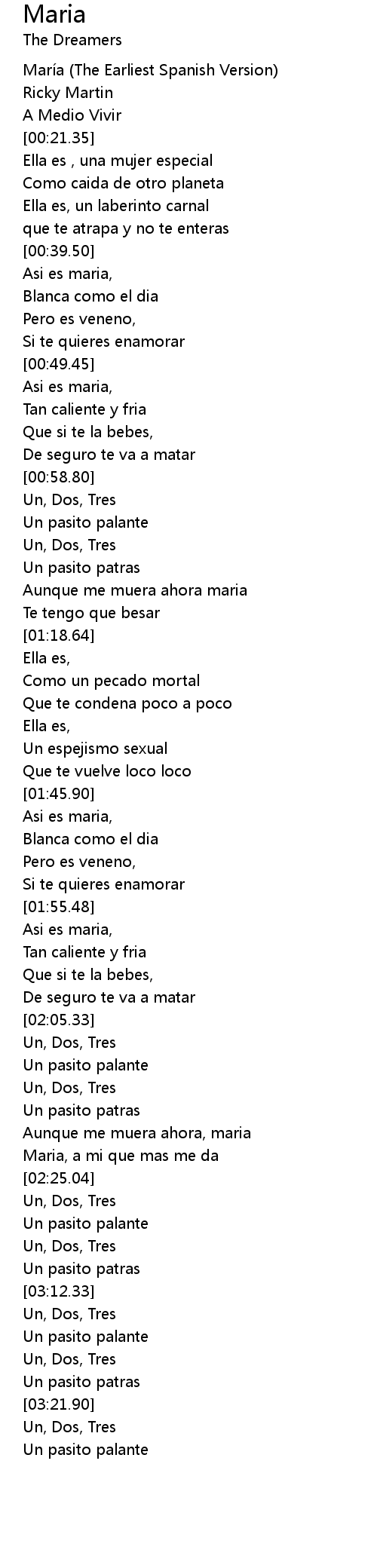 | [00:04.20] | María (The Earliest Spanish Version) |
