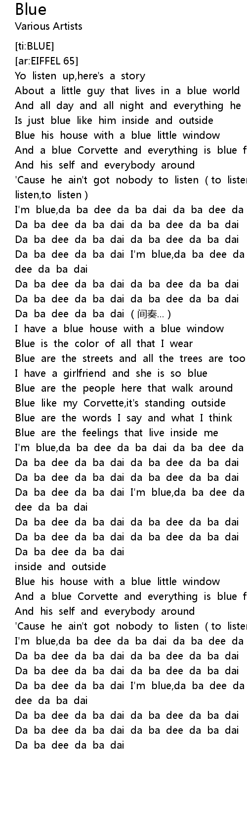| [02:03.893] | Da ba dee da ba dai I' m blue, da ba dee da ba dai da ba dee da ba dai |