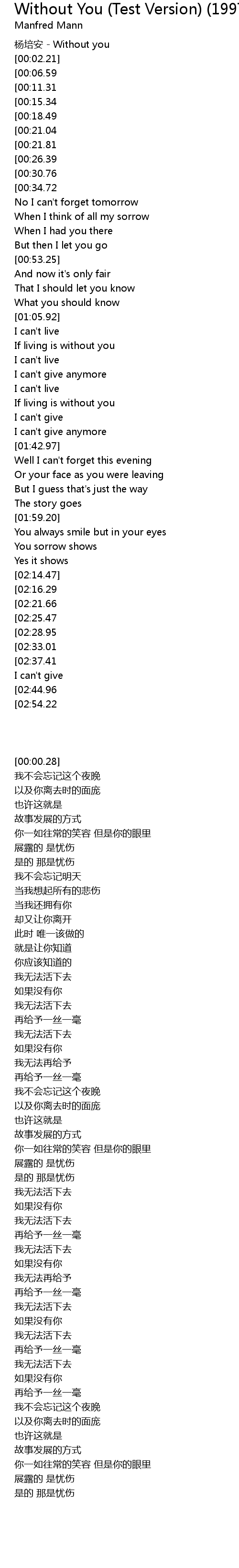 | [00:00.28] | 杨培安 - Without you |