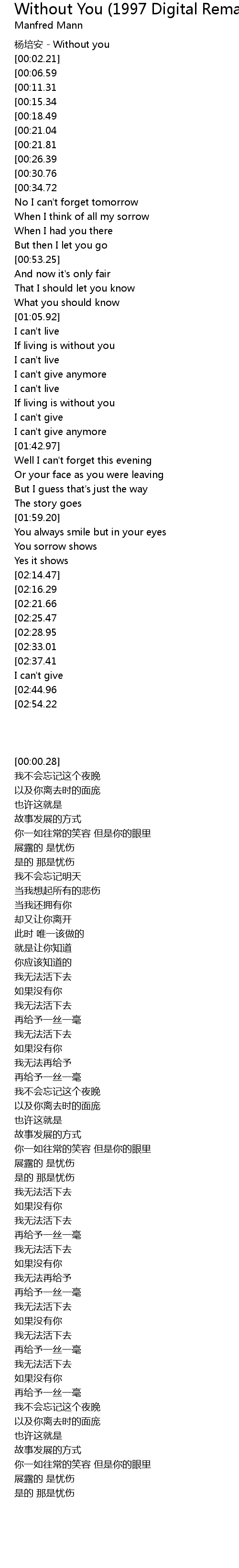 | [00:00.28] | 杨培安 - Without you |