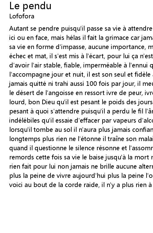 | Autant se pendre puisqu' il passe sa vie a attendre que quelque chose se passe ici ou en face, mais he las il fait la grimace car jamais rien ne se passe dans sa vie en forme d' impasse, aucune importance, maintenant il est trop tard, e chec et mat, il s' est mis a l'e cart, pour lui a n' est de ja plus l' heure d' avoir l' air stable, fiable, imperme able a l' ennui qui le suit, l' accable, l' accompagne jour et nuit, il est son seul et fide le ami le seul qui ne l' ait jamais quitte ni trahi aussi 100 fois par jour, il meurt de soif se perd dans le de sert de l' angoisse en ressort ivre de peur, ivre de cole re rien a faire. lourd, bon Dieu qu' il est pesant le poids des jours, lourd grand Dieu, tellement pesant a quoi s' attendre puisqu' il a perdu le fil l' me salie de traces inde le biles qu' il essaie d' effacer par vapeurs d' alcool aucune main ne se tend lorsqu' il tombe au sol il n' aura plus jamais confiance en personne, depuis trop longtemps plus rien ne l'e tonne il tra ne son malaise qui pe se des tonnes quand il questionne le silence re sonne et l' assomme alors a grands coups de remords cette fois sa vie le baise jusqu'a la mort ni l' amour ni dieu n' ont rien fait pour lui non jamais ne brille aucune alternative a ne vaut de ja plus la peine de vivre aujourd' hui plus la peine l' on vienne a son aide le voici au bout de la corde raide, il n' y a plus rien a faire |