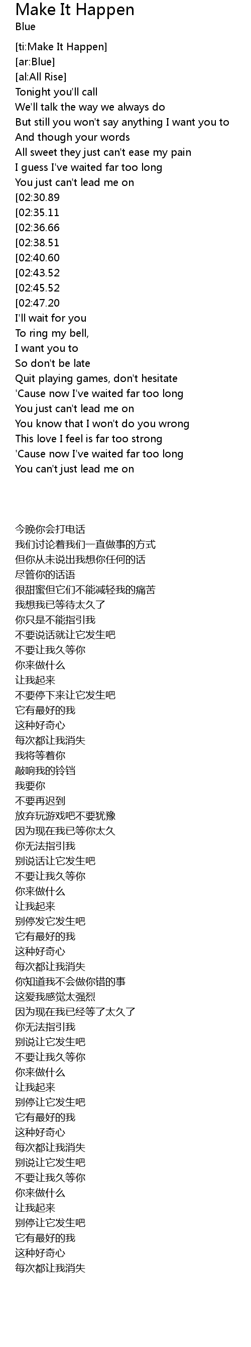 | [02:53.13][02:35.11][01:42.97][00:55.09] | Don't make me wait for you |