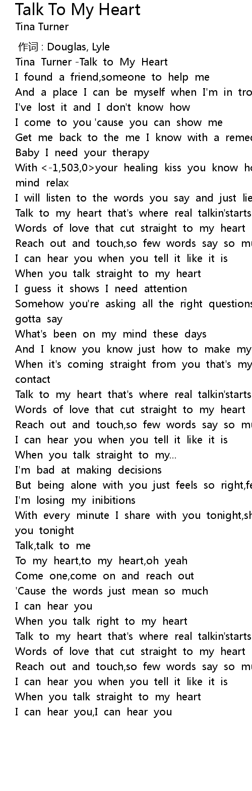 | [00:01.22] | Tina Turner Talk to My Heart |