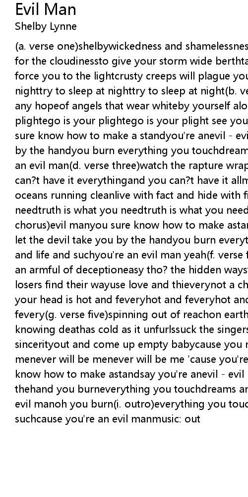 (a. verse one)shelbywickedness and shamelessnessare holding you on earthmake way for the cloudinessto give your storm wide berthtake away your poison prideand force you to the lightcrusty creeps will plague youas you try to sleep at nighttry to sleep at nighttry to sleep at night(b. verse two)say bye - bye to any hopeof angels that wear whiteby yourself alone you areand ego is your plightego is your plightego is your plight see you're an(c. chorus)evil manyou sure know how to make a standyou're anevil - evil manyou let the devil take you by the handyou burn everything you touchdreams and love and life and suchyou're an evil man(d. verse three)watch the rapture wrap you upunfolded as you fallyou can?t have it everythingand you can?t have it allmesmerize your only childwith oceans running cleanlive with fact and hide with fictioncause truth is what you needtruth is what you needtruth is what you needyeah 'cause you're(e. chorus)evil manyou sure know how to make astandsay you're anevil - evil manyou let the devil take you by the handyou burn everything you touchdreams and love and life and suchyou're an evil man yeah(f. verse four)coastal waters hold youin an armful of deceptioneasy tho? the hidden waysforbidden to take actionsorry losers find their wayuse love and thieverynot a chance in redemptions hellcause your head is hot and feveryhot and feveryhot and feveryhot and feverhot and fevery(g. verse five)spinning out of reachon earth as he?s cover wordsreality is knowing deathas cold as it unfurlssuck the singers furycause you lack sincerityout and come up empty babycause you never will be menever will be menever will be menever will be me 'cause you're an(h. chorus)evil manyou sure know how to make astandsay you're anevil - evil manyou let the devil take you by thehand you burneverything you touchdreams and love and life and suchyou're an evil manoh you burn(i. outro)everything you touchdreams and loveand life and suchcause you're an evil manmusic: out |