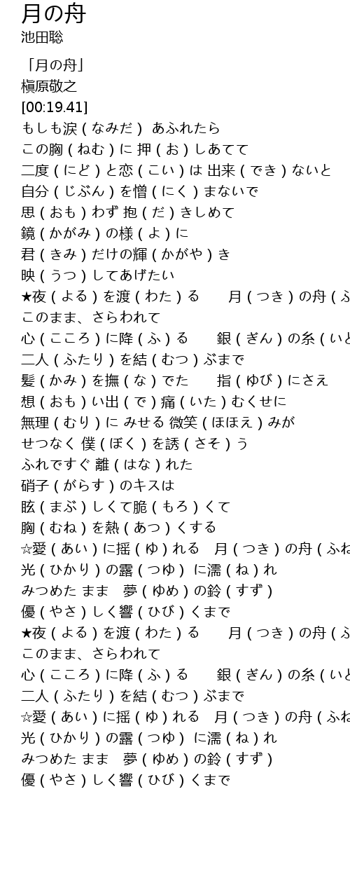 | [04:10.26] | ☆愛(あい)に摇(ゆ)れる 月(つき)の舟(ふね) |
