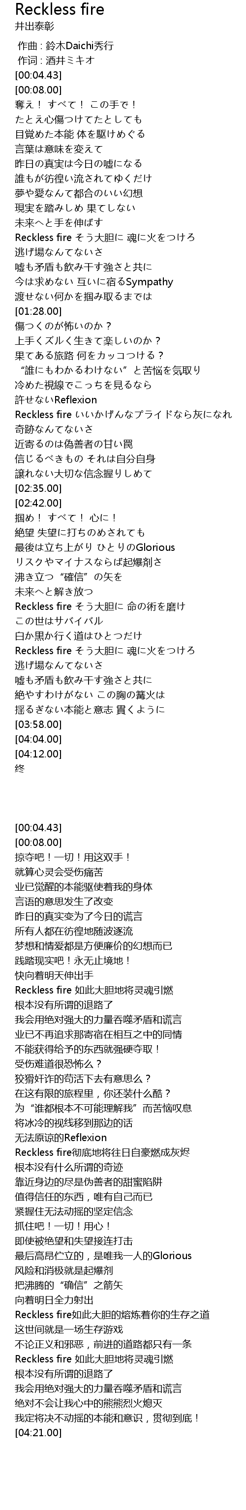 | [03:30.00] | Reckless fire そう大胆に 魂に火をつけろ |