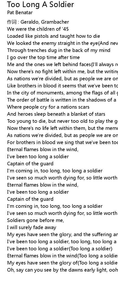 | I'm coming in, too long, too long a soldier | |