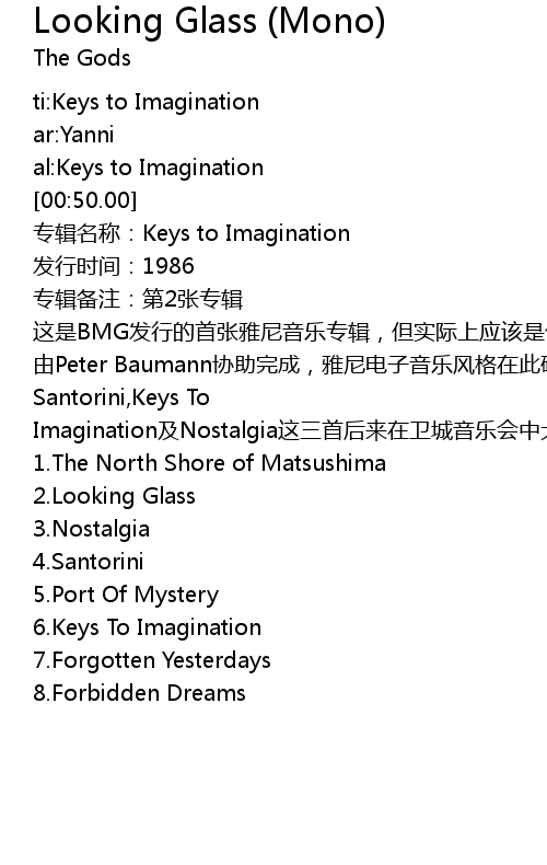 | [03:00.00] | Santorini,Keys To Imagination及Nostalgia这三首后来在卫城音乐会中大放光彩的作品最初均收录于此。 |