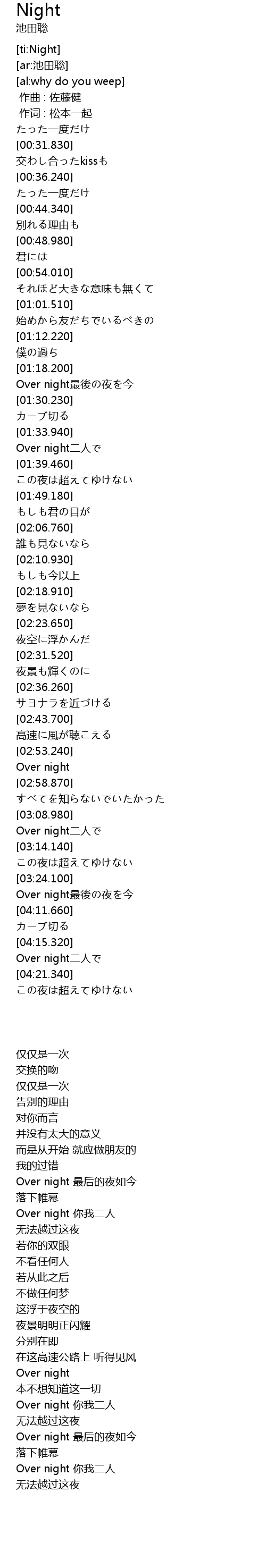 | [03:10.010] | Over night二人で |