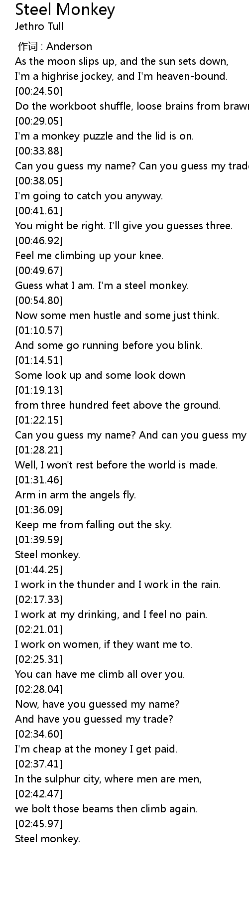 | [00:52.67] | Guess what I am. I' m a steel monkey. |