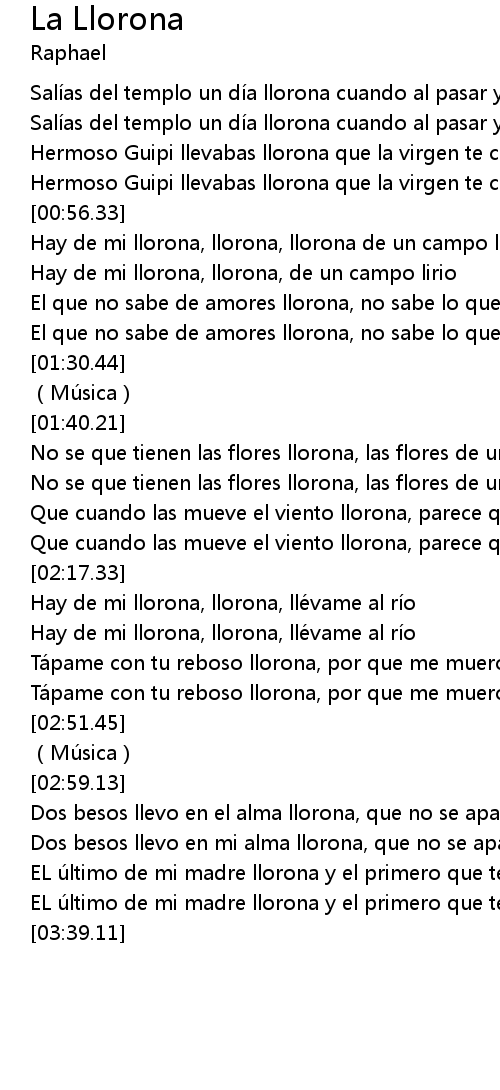 | [02:25.97] | Hay de mi llorona, llorona, lle vame al ri o |