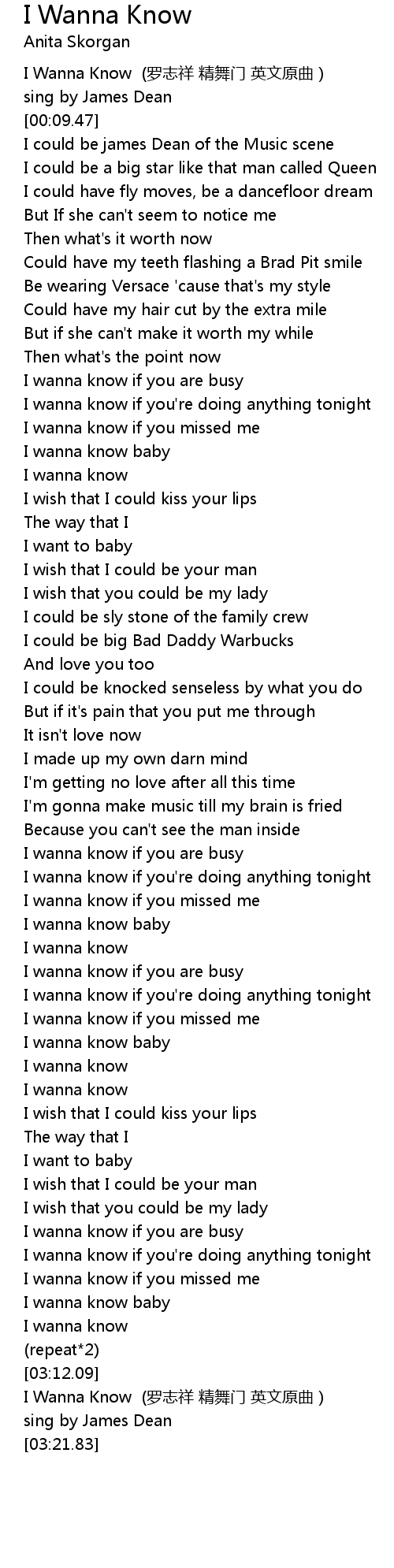 | [00:02.72] | I Wanna Know luó zhì xiáng jīng wǔ mén yīng wén yuán qǔ |