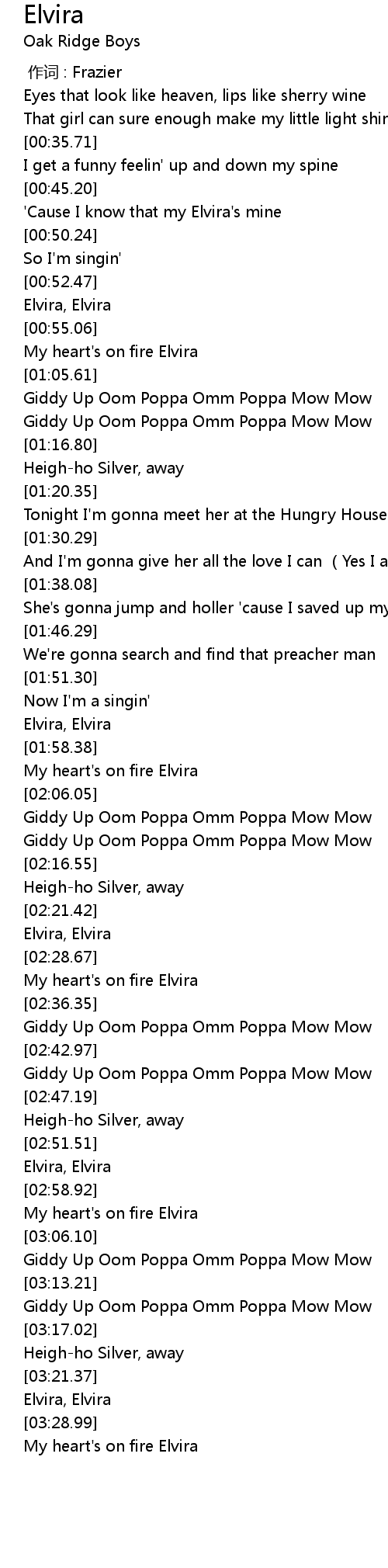 | [02:55.00] | Elvira, Elvira |