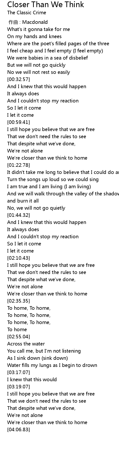 | [03:49.69] | We' re closer than we think to home |