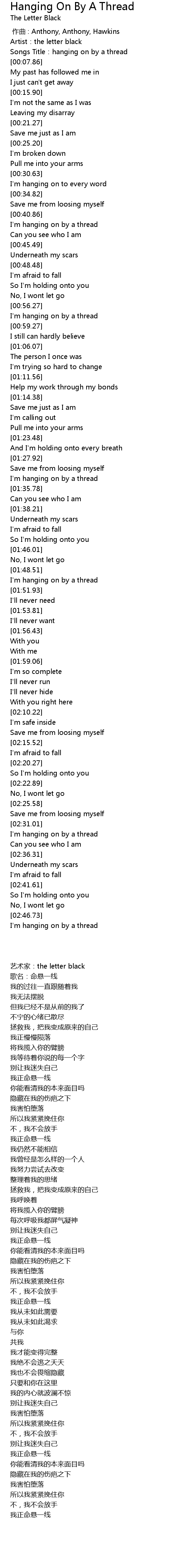 | [00:04.80] | Songs Title:hanging on by a thread |