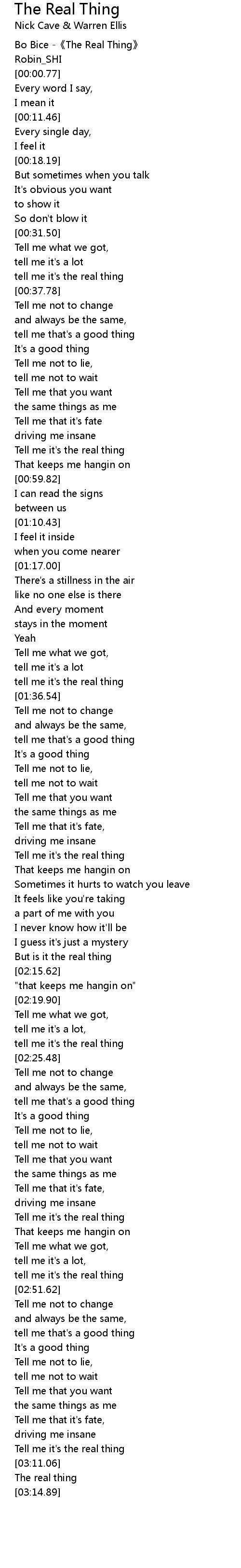 | [03:08.82] | Tell me it' s the real thing |