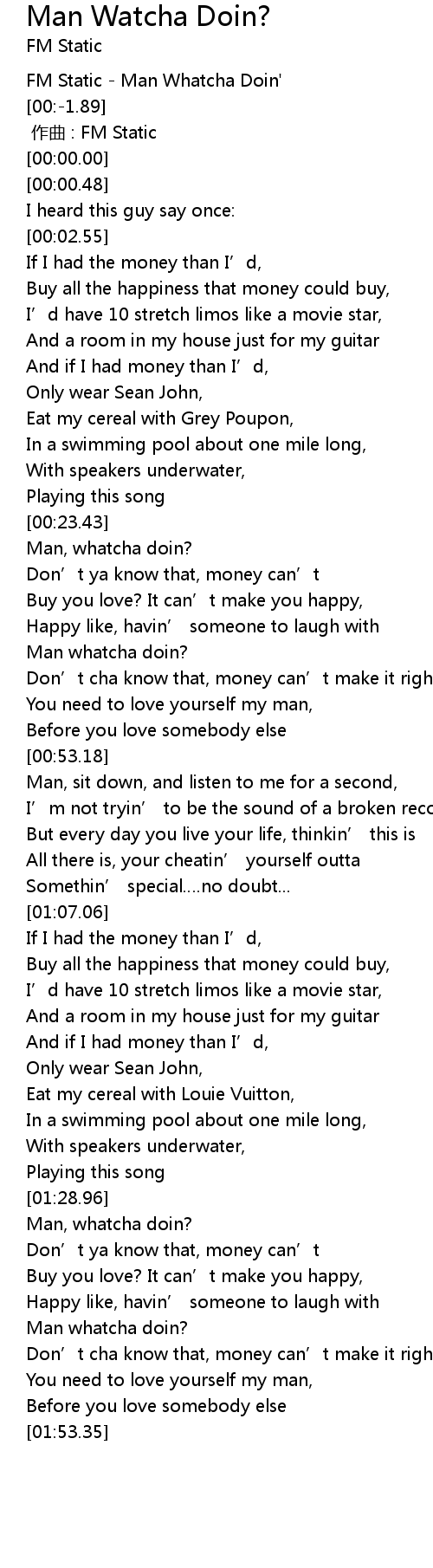 | [00:-2.12] | FM Static - Man Whatcha Doin' |