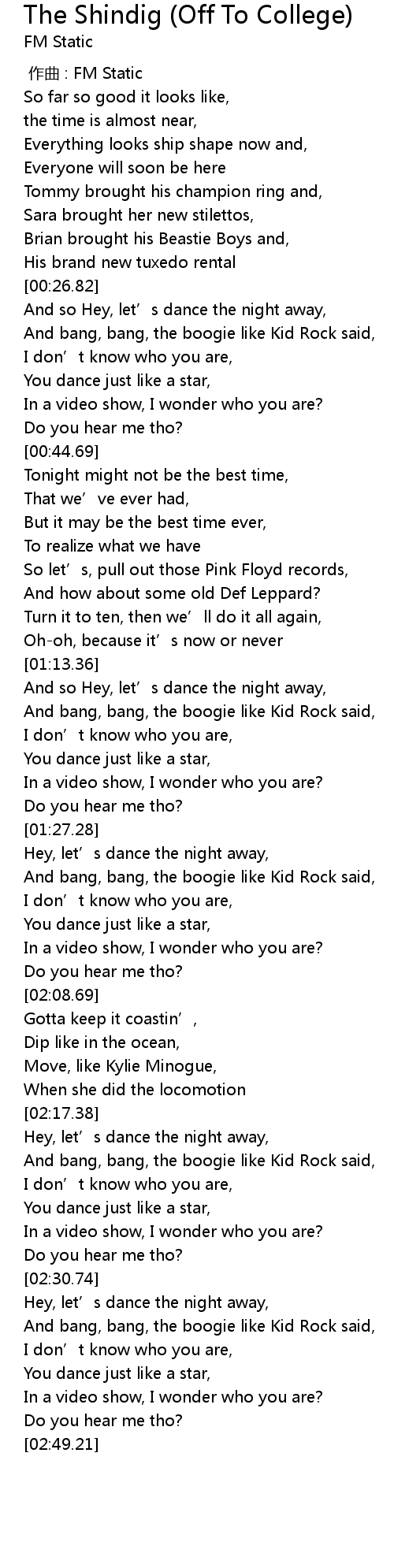 | [02:20.16] | And bang, bang, the boogie like Kid Rock said, |