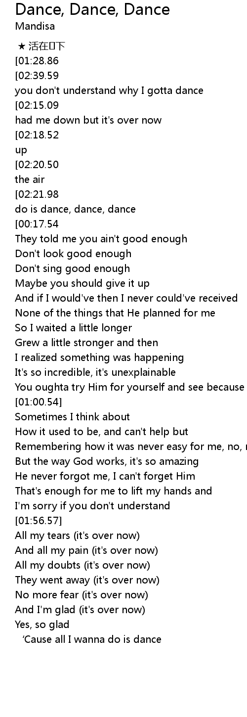 | [02:46.72][02:39.59][02:25.55][02:12.09][01:43.49][01:29.18][00:46.83][00:04.48] | Maybe you don't understand why I gotta dance |