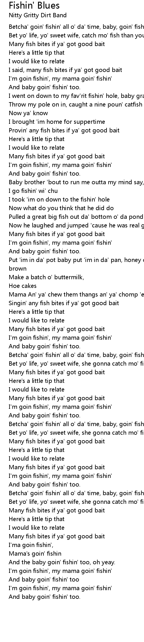 Betcha' goin' fishin' all o' da' time, baby, goin' fishin' too |