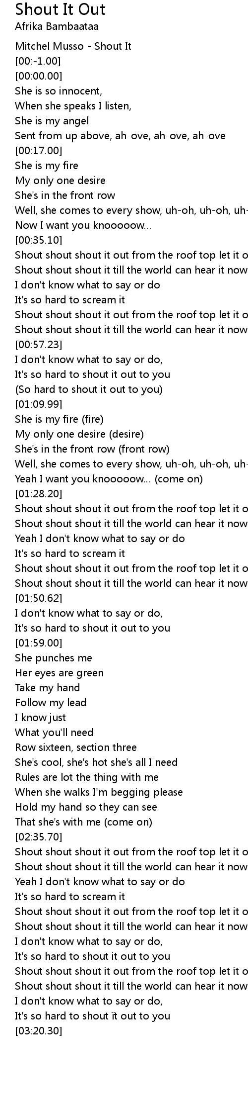 | [00:50.29] | Shout shout shout it out from the roof top let it out |