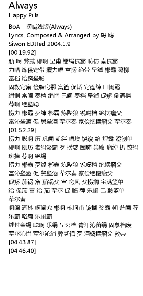 | [00:00.88] | BoA - 捞喊浅版(Always) |