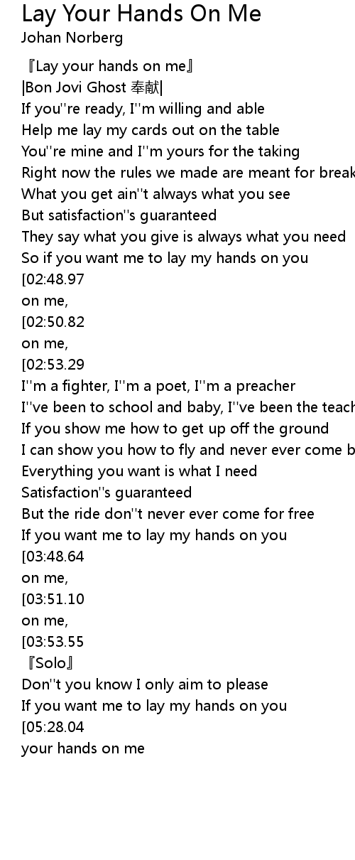 | [03:00.33][02:50.82] | Lay your hands on me, lay your hands on me, lay your hands on me, |