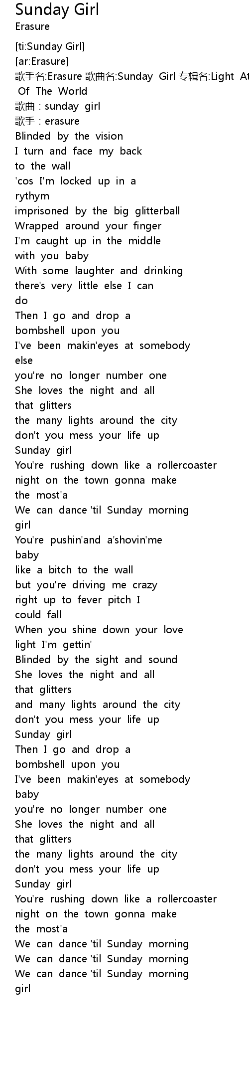 | [00:00.95] | 歌手名:Erasure 歌曲名:Sunday Girl 专辑名:Light At The End Of The World |
