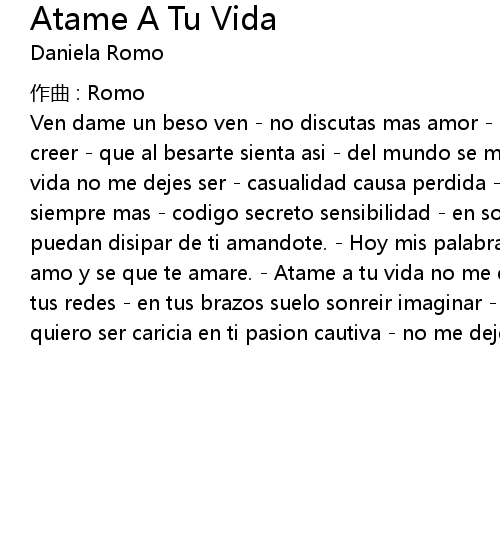| Ven dame un beso ven - no discutas mas amor - ahora ven abrazame - ven no puedo creer - que al besarte sienta asi - del mundo se me van los pies. - Atame a tu vida no me dejes ser - casualidad causa perdida - quiero ser tu posibilidad por siempre mas - codigo secreto sensibilidad - en soledad todas tus dudas - que se puedan disipar de ti amandote. - Hoy mis palabras son sin sentido o con el - te amo y se que te amare. - Atame a tu vida no me dejes ir - que quiero estar entre tus redes - en tus brazos suelo sonreir imaginar - mientras dure mientars viva - quiero ser caricia en ti pasion cautiva - no me dejes mas huir de mi buscandote. |