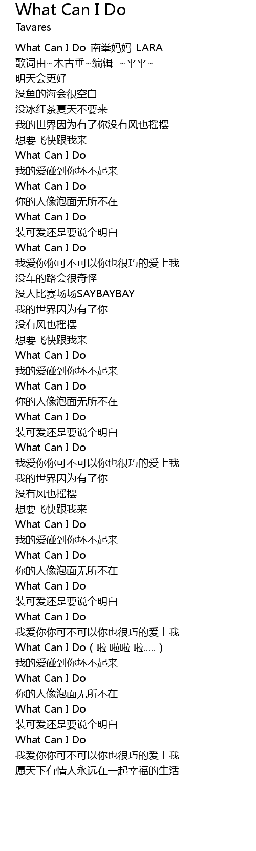 | [00:00.00] | What Can I Do-南拳妈妈-LARA |