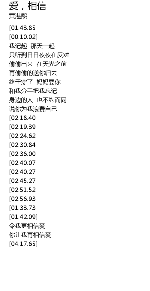 | [04:19.53][01:43.85][00:01.51] | 黄湛熙 - 爱,相信 |
