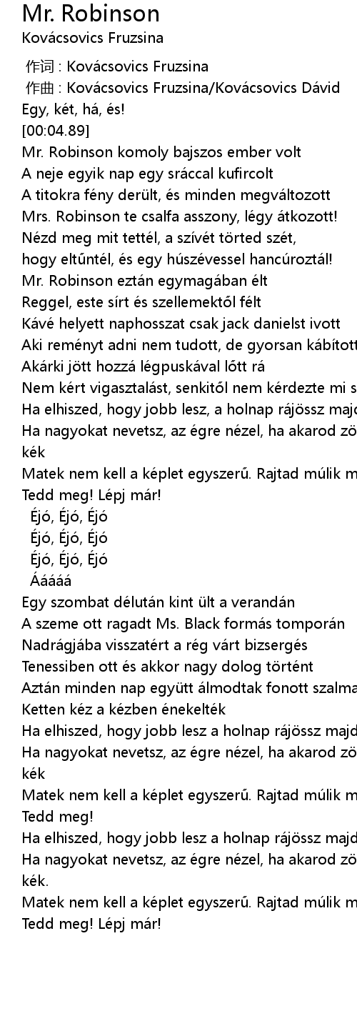 | [00:14.16] | Mr. Robinson komoly bajszos ember volt |