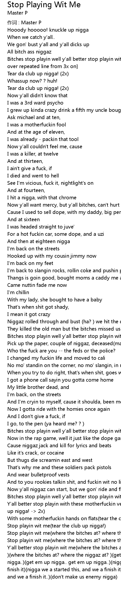 | Bitches stop playin well y' all better stop playin wit me repeat 6x master p over repeated line from 3x on | |