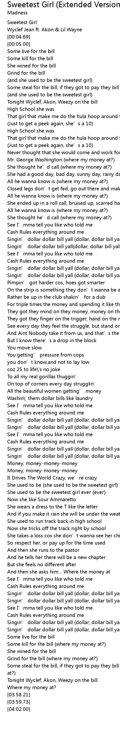 | [00:55.26] | All he wanna know is (where my money at?) |