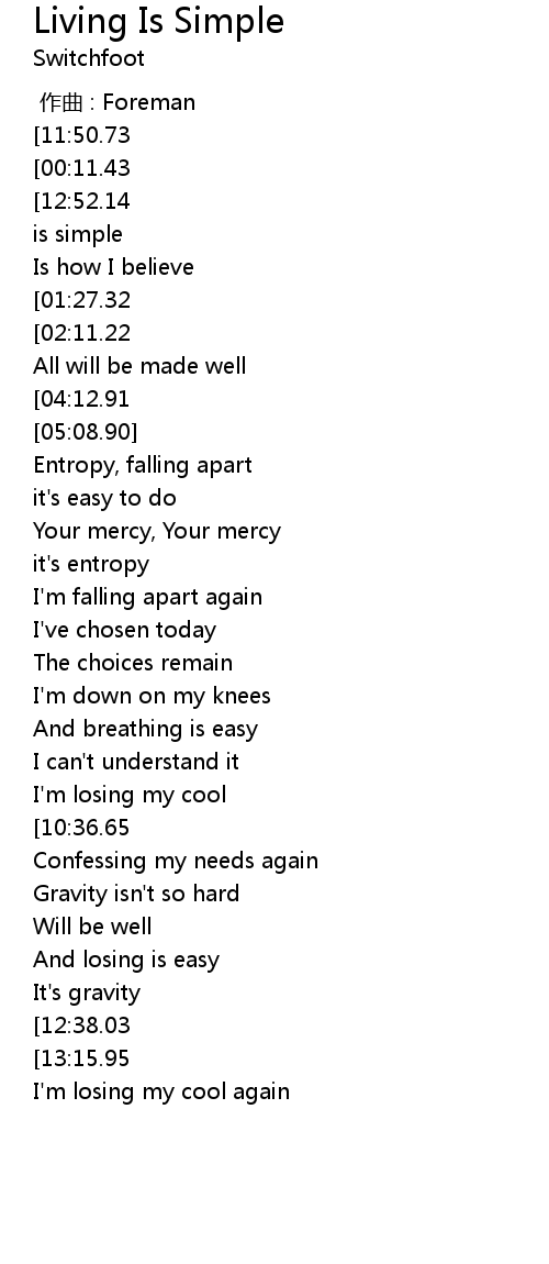 | [17:24.81][12:52.14][12:24.52][11:45.53][09:23.16][08:59.47][08:29.83][07:56.00][05:07.25][04:29.59][04:17.75][02:07.95][00:18.92] | Living is simple |