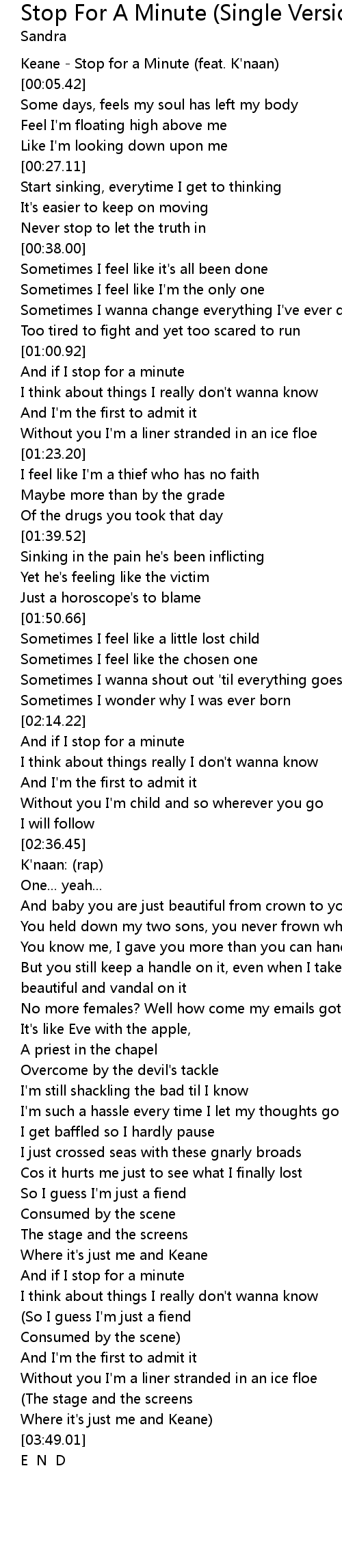 [00:00.00] Keane - Stop for a Minute (feat. K'naan)