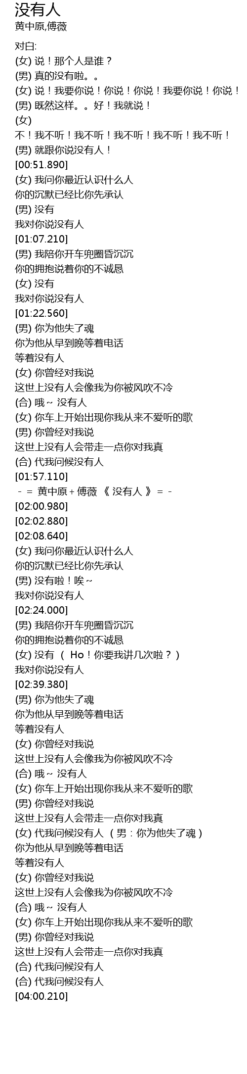 | [01:59.110] | -= 黄中原+傅薇 《 没有人 》=- |