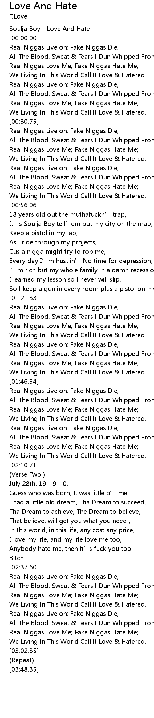 | [00:25.38] | Real Niggas Love Me; Fake Niggas Hate Me; |