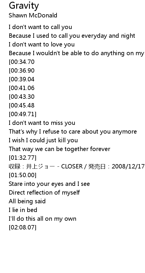 | [01:17.82][00:34.70] | Gravity starts to pull me down a little |
