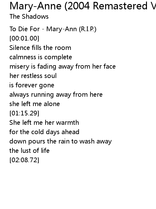 | [00:00.00] | To Die For - Mary-Ann (R.I.P.) |
