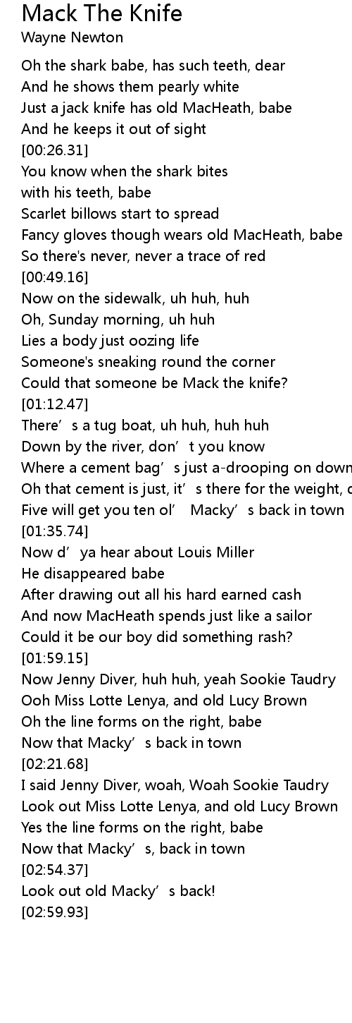 | [00:15.43] | Just a jack knife has old MacHeath, babe |