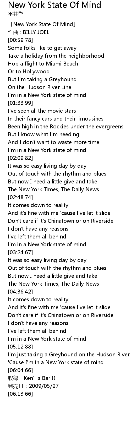 | [05:38.69] | ' Cause I' m in a New York state of mind |