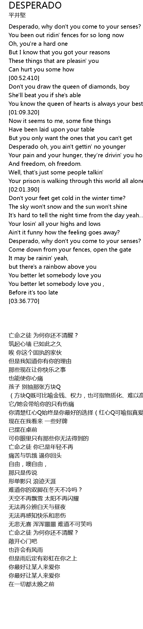 | [02:35.490] | Desperado, why don' t you come to your senses? |