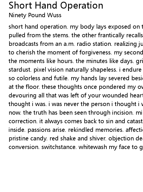 short hand operation. my body lays exposed on the operating table. one blind eye pulled from the stems. the other frantically recalls memories like news broadcasts from an a.m. radio station. realizing just what i've become. i turn to cherish the moment of forgiveness. my second skin being removed so slowly. the moments like hours. the minutes like days. grinding through see-saw stardust. pixel vision naturally shapeless. i endure this captivity. my regret so colorless and futile. my hands lay severed beside me. dull, pale, scratching at the floor. these thoughts once pondered my own self destruction. i remember devouring all that was left of your wounded heart. i was never the person you thought i was. i was never the person i thought i was. i'm without, i'm nothing now. the truth has been seen through incision. mind intercourse, thought correction. it always comes back to sin and catastrophe. desire welling up inside. passions arise. rekindled memories. affections so bliss. forgotten pristine candy. red shake and shiver. objection dead. skin crawling. chaotic conversion. switchstance. whitewash my face to gleam again. |