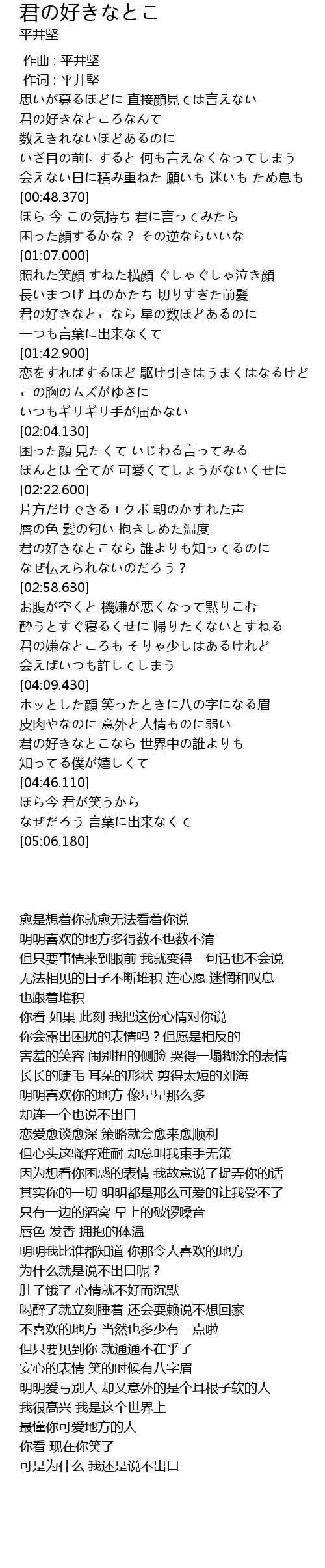 | [04:29.460] | 君の好きなとこなら 世界中の誰よりも |