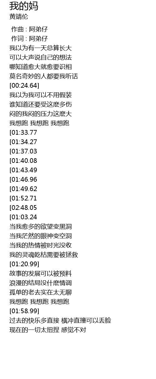 | [02:29.11][01:37.03][00:40.27] | 我的妈 世界不像话 |