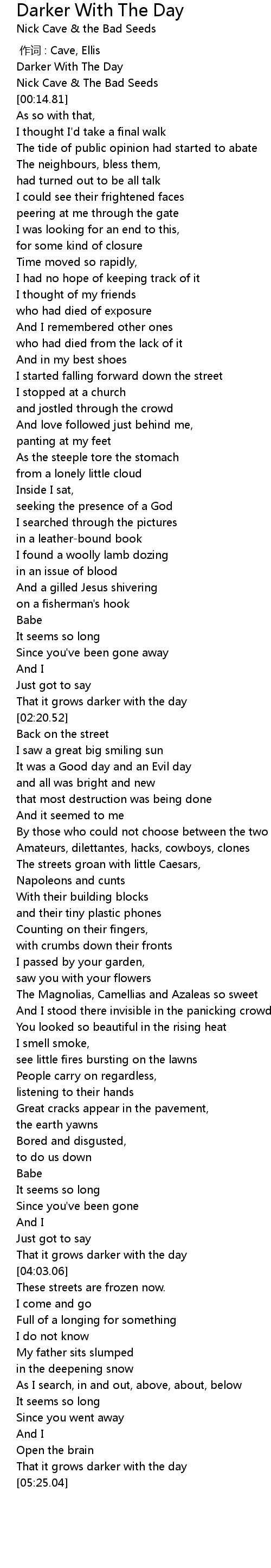 | [05:17.44] | That it grows darker with the day |