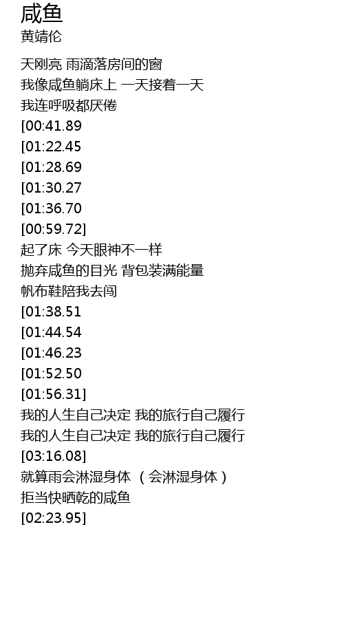 | [02:50.20][01:46.23] | 咸鱼翻身那天我会记住你的笑脸当作纪念 |